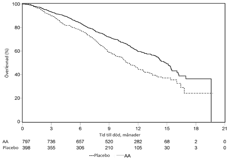 En statistiskt signifikant förbättring av OS till fördel för AA‑P plus ADT observerades med en 34 % minskning av risken för dödsfall jämfört med placebo plus ADT (riskkvot = 0,66; 95 % CI: 0,56, 0,78; p < 0,0001) (se tabell 3 och figur 2).