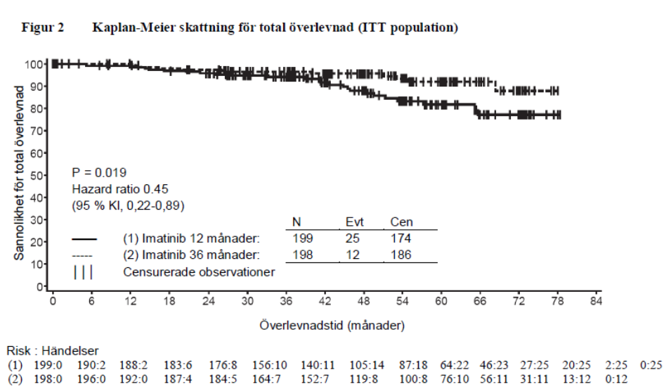 Dessutom förlängde 36-månaders behandling med imatinib signifikant den totala överlevnaden (OS) jämfört med 12-månaders behandling med imatinib (HR = 0,45 [0,22-0,89], p=0,0187) (Tabell 8, Figur 2).