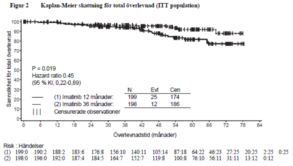 Dessutom förlängde 36-månaders behandling med Imatinib signifikant den totala överlevnaden (OS) jämfört med 12-månaders behandling med Imatinib (HR = 0,45 [0,22-0,89], p=0,0187) (Tabell 8, Figur 2).