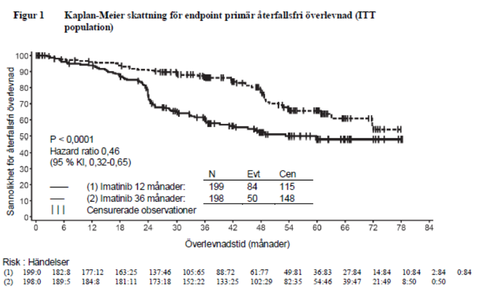 Trettiosex (36) månaders behandling med Imatinib förlängde signifikant RFS jämfört med 12 månaders behandling med Imatinib (hazard ratio (HR) = 0,46 [0,32-0,65], p<0,0001) (Tabell 8, Figur 1).