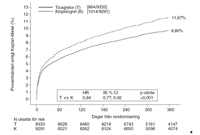 Tillsammans med daglig basal ASA-behandling visade sig tikagrelor 90 mg två gånger dagligen vara överlägset 75 mg klopidogrel dagligen för att förhindra det sammansatta effektmåttet bestående av kardiovaskulär död, hjärtinfarkt eller stroke, varvid skillnaden utgjordes av kardiovaskulär död och hjärtinfarkt. Patienterna erhöll en laddningsdos på 300 mg klopidogrel (eventuellt 600 mg om de genomgått PCI) eller 180 mg tikagrelor.