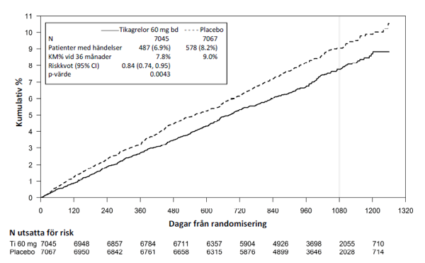 Båda regimerna 60 mg två gånger dagligen och 90 mg två gånger dagligen av tikagrelor i kombination med ASA var överlägsna enbart ASA vid preventionen av aterotrombotiska händelser (sammansatt effektmått: kardiovaskulär död, hjärtinfarkt och stroke), med en enhetlig behandlingseffekt över hela studieperioden, vilket gav en RRR på 16 % och en ARR på 1,27 % för tikagrelor 60 mg och en RRR på 15 % och en ARR på 1,19 % för tikagrelor 90 mg.