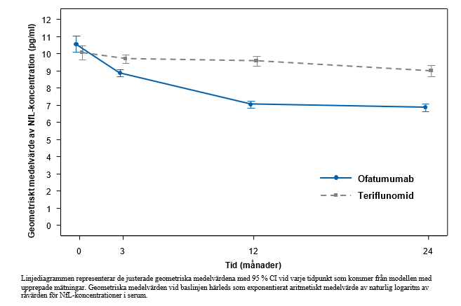 Ofatumumab jämfört med teriflunomid minskade signifikant NfL-koncentrationerna från den första bedömningen efter 3 månader (se tabell 3 och figur 2).