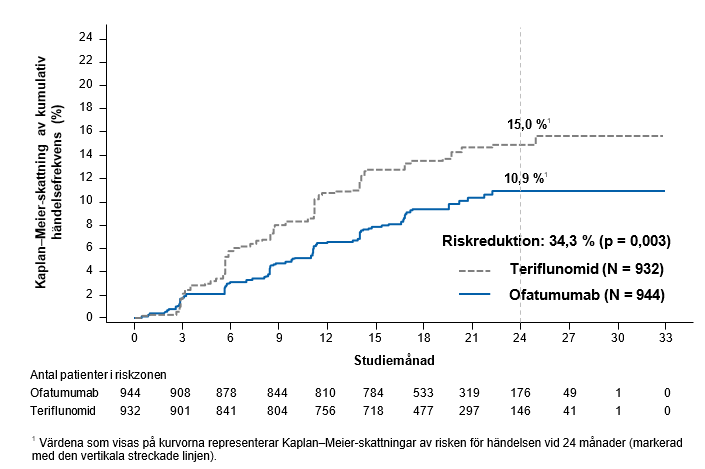 Den prespecificerade metaanalysen av kombinerade data visade att ofatumumab i jämförelse med teriflunomid signifikant minskade risken för 3 månaders bekräftad progression av funktionsnedsättning med 34,3 % och risken för 6 månaders bekräftad progression av funktionsnedsättning med 32,4 % (se figur 1).