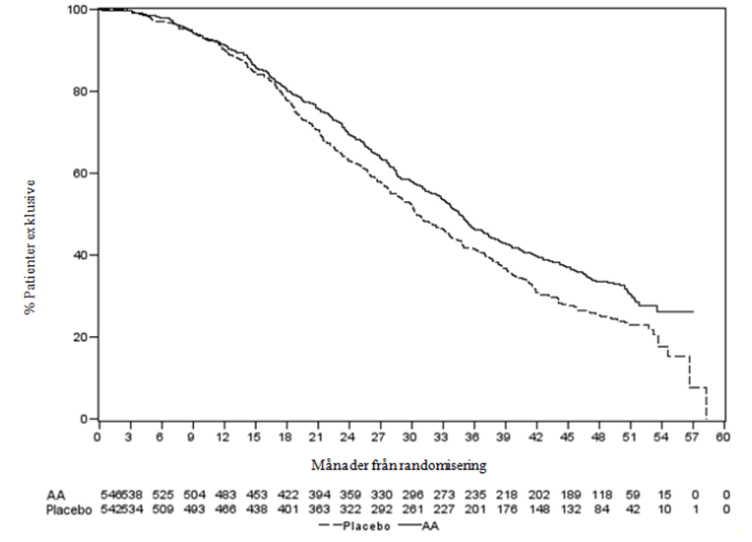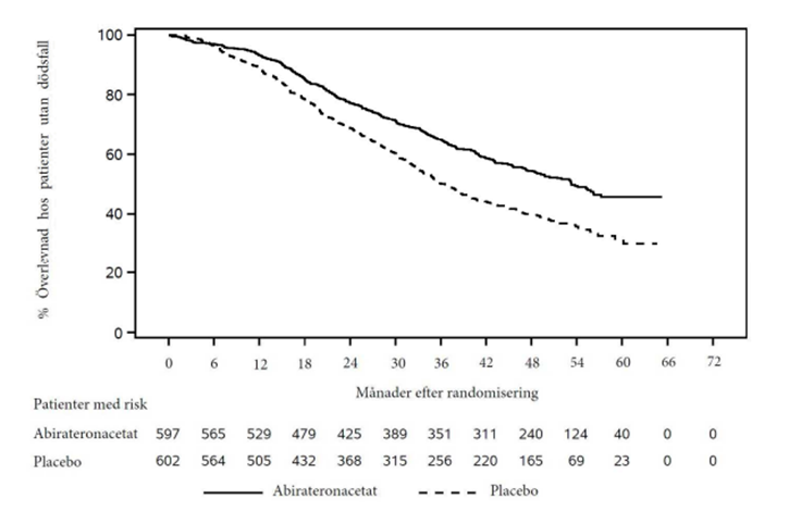 Den planerade slutliga analysen för OS utfördes efter att 741 dödsfall observerats (median uppföljningstid 49 månader). Sextiofem procent (354 av 546) av patienterna behandlade med abirateronacetat, jämfört med 71 % (387 av 542) av patienterna behandlade med placebo, hade avlidit. En statistiskt signifikant OS-fördel som talade för den abirateronacetatbehandlade gruppen påvisades med 19,4 % minskning av risken för dödsfall (riskkvot = 0,806; 95 % KI: [0,697; 0,931], p = 0,0033) och en förbättring av median OS på 4,4 månader (abirateronacetat 34,7 månader, placebo 30,3 månader) (se tabell 6 och figur 5). Den här förbättringen påvisades trots att 44 % av patienterna i placebogruppen fick abirateronacetat som efterföljande behandling.