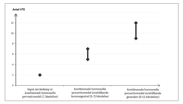 Man beräknar1 att mellan 9 - 12 av 10 000 kvinnor som använder ett kombinerat hormonellt preventivmedel med gestoden kommer att utveckla en VTE under ett år, jämfört med cirka 6