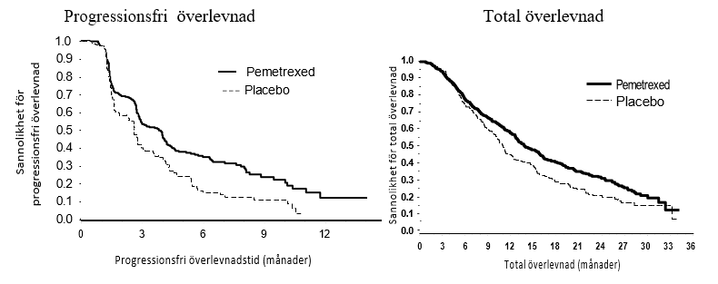 Studien uppfyllde primärt effektmått och visade en statistiskt signifikant förbättring i progressionsfri överlevnadstid (PFS) i pemetrexed-armen jämfört med placebo-armen (n = 581, oberoende granskning av populationen, medianvärde 4 respektive