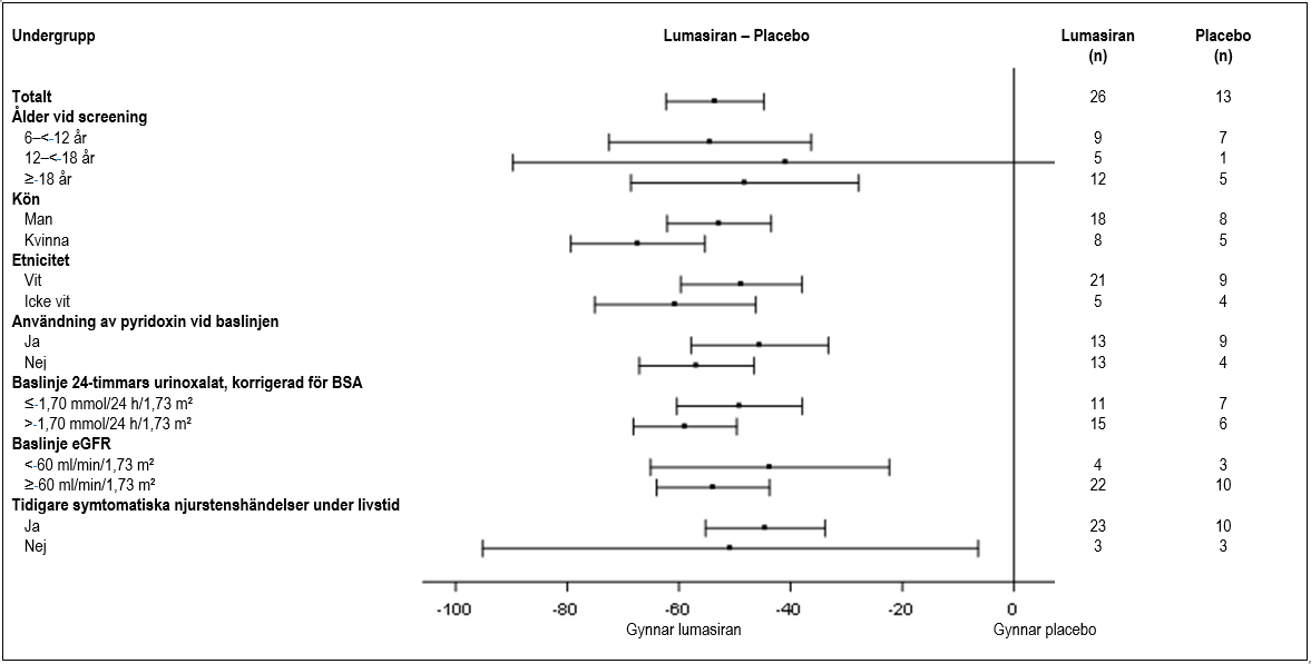 Reduktionen i 24‑timmars urinoxalat från baslinjen (korrigerad för BSA), hos patienter med PH1 som fick lumasiran jämfört med placebo, var liknande i alla förspecificerade undergrupper, inklusive ålder, kön, etnicitet, nedsatt njurfunktion, användning av pyridoxin (vitamin B6) och tidigare symtomatiska njurstenshändelser (figur 2).