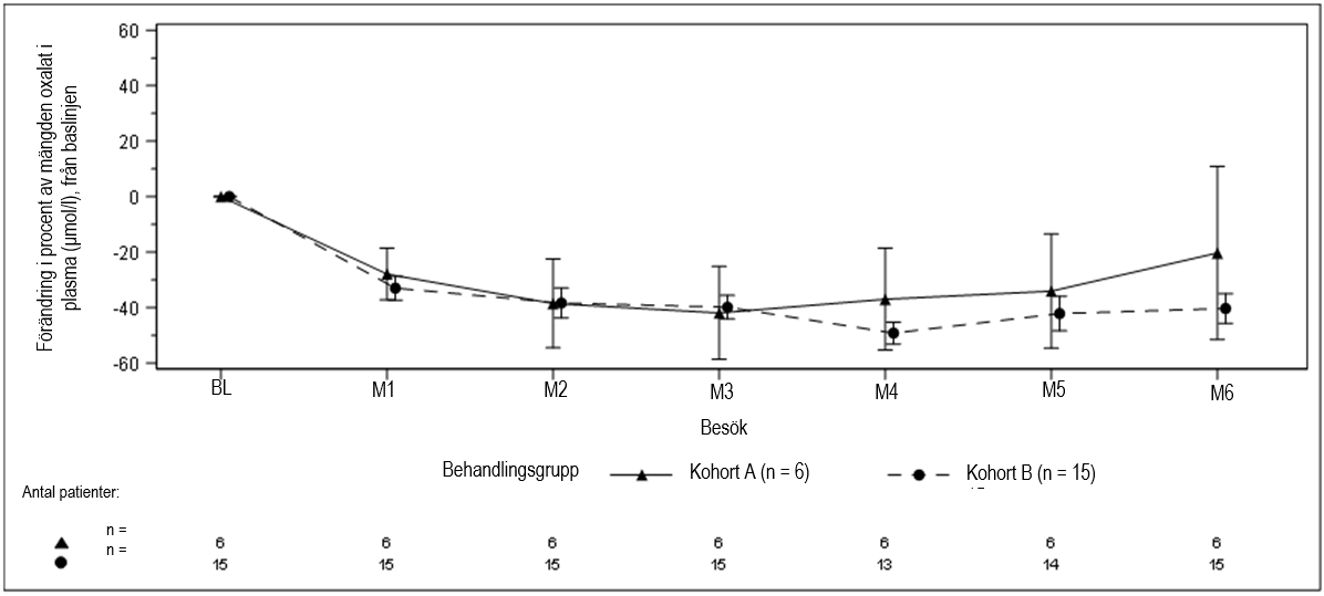 Under den 6 månader långa, primära analysperioden reducerades plasmaoxalat hos patienterna i båda kohorterna så tidigt som månad 1. Den procentuella förändringen i plasmaoxalatnivå från baslinjen till månad 6 (genomsnitt från månad 3 till månad 6) var för kohort A en skillnad i minsta kvadratmedelvärde på ‑33,3 % (95 % KI, ‑81,82, 15,16). För kohort B var skillnaden i minsta kvadratmedelvärde ‑42,4 % (95 % KI, ‑50,71, ‑34,15).