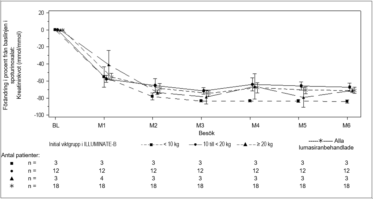 Vid månad 6 uppnådde patienterna som behandlades med lumasiran en reduktion på 72% (95 % KI: 66,4, 77,5) på spotvärdet av kvoten mellan urinoxalat och kreatinin från baslinjen (genomsnittligt från månad 3 till och med månad 6), det primära effektmåttet. Lumasiran förknippades med snabba och kvarvarande reduktioner i spotvärdet av kvoten mellan urinoxalat och kreatinin (figur 3) som var liknande i alla viktstrata. Den procentuella reduktionen i utsöndring av urinoxalat