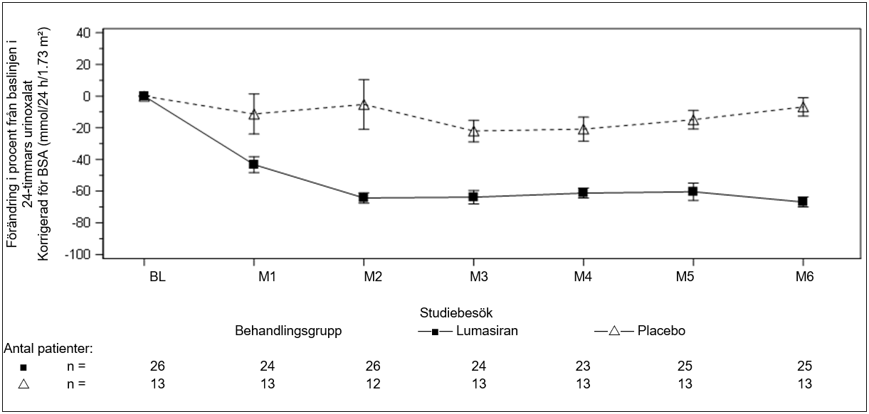 Det primära effektmåttet var den genomsnittliga minskningen i procent från baslinjen i 24‑timmars urinoxalatutsöndring, korrigerad för BSA, under månaderna 3 till och med 6. Lumasiran förknippades med en statistiskt signifikant reduktion på 65,4 % i 24‑timmars urinoxalat, korrigerad för BSA, jämförd med 11,8 % i placebogruppen, vilket utgjorde en skillnad på 53,5 % (95 % KI: 44,8, 62,3; p < 0,0001). I överensstämmelse med det primära effektmåttet observerades en reduktion på 60,5 % vid månad 6 i spotvärdet av kvoten mellan urinoxalat och kreatinin i lumasiranarmen, jämfört med en reduktion på 8,5 % i placeboarmen. Dessutom hade patienterna som behandlades med lumasiran en snabb och kvarvarande minskning i 24‑timmars urinoxalat, korrigerad för BSA, vilket visas i figur 1.