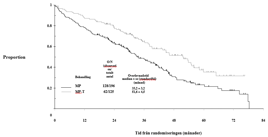 Enligt per protocol-analysen utfördes en uppdatering för studien IFM 99-06 vilket gav ytterligare 15 månaders uppföljningsdata. Den genomsnittliga totala överlevnaden (OS) var 51,6 ± 4,5 och 33,2 ± 3,2 månader i MPT- respektive MP-grupperna