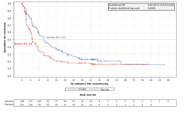 Förspecificerade undergruppsanalyser av OS och RFS visade en konsekvent behandlingseffekt för Onureg i demografiska och sjukdomsrelaterade undergrupper såsom cytogenetisk risk vid baslinjen, antal tidigare konsolideringscykler samt CR-/CRi-status.