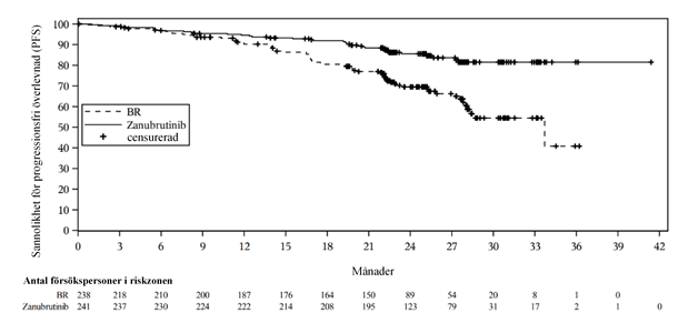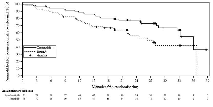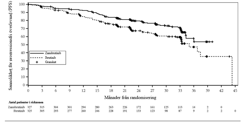 Totalt 652 patienter var inkluderade vid den förspecificerade tidpunkten för slutlig PFS-analys (brytdatum 8 augusti 2022). Den mediana uppföljningstiden för PFS 28,1 månader enligt bedömning av prövare och 30,7 månader enligt bedömning av IRC. Zanubrutinib uppvisade superioritet i PFS jämfört med ibrutinib enligt bedömning av prövare och IRC. Totalt 652 patienter skrevs in. Effektresultaten för PFS enligt bedömning av prövare och IRC presenteras i tabell 9, och ett Kaplan-Meyer-diagram om PFS enligt bedömning av IRC finns i figur 2.