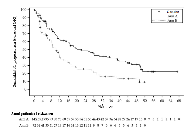 Randomiseringen var stratifierad enligt antalet tidigare behandlingar (2‑3 jämfört med > 3), rituximab-refraktär status (ja jämfört med nej) och geografisk region (Kina jämfört med övriga länder/regioner).