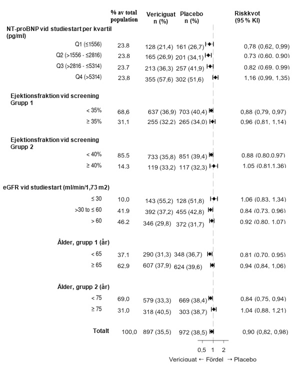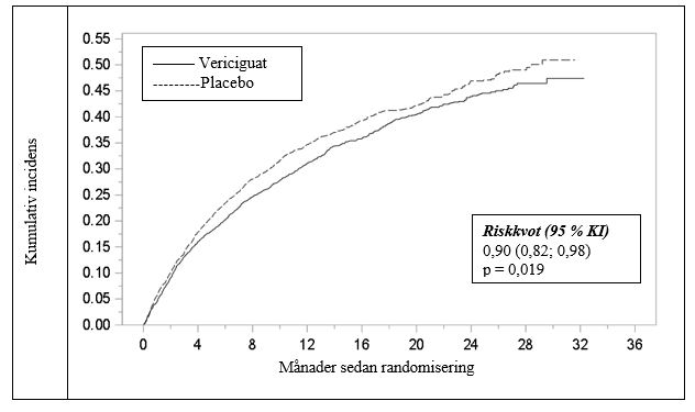 Vericiguat var överlägset placebo vad gäller minskning av risken för kardiovaskulär död eller sjukhusinläggning på grund av hjärtsvikt, baserat på en analys av tiden till händelse. Under studien var den årliga absoluta riskreduktionen (ARR) 4,2 % med vericiguat jämfört med placebo. Således skulle 24 patienter behöva behandlas under i genomsnitt 1 år för att förhindra 1 av de händelser som ingick i det primära effektmåttet. Behandlingseffekten speglade en minskning av risken för kardiovaskulär död, sjukhusinläggning på grund av hjärtsvikt, dödlighet oavsett orsak eller sjukhusinläggning på grund av hjärtsvikt och totalt antal sjukhusinläggningar på grund av hjärtsvikt (se tabell 2 och figur 1).