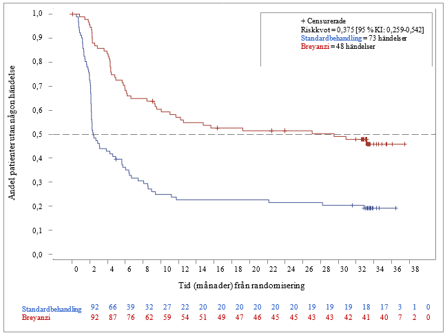 Av de 88 patienter som fick Breyanzi var 81 patienter utvärderbara avseende effekt och hade fått minst två linjer av systemisk behandling tidigare inklusive en BTK‑hämmare och inkluderades i effektdatasetet: fem patienter var inte utvärderbara avseende effekt eftersom de inte hade PET‑positiv sjukdom vid baslinjen eller bekräftat PET‑positiv sjukdom efter cancerbehandling för sjukdomskontroll enligt en oberoende granskningskommitté, en patient hade inte fått minst två linjer av systemisk behandling inklusive en BTK‑hämmare tidigare och en patient hade inte fått en BTK‑hämmare tidigare.