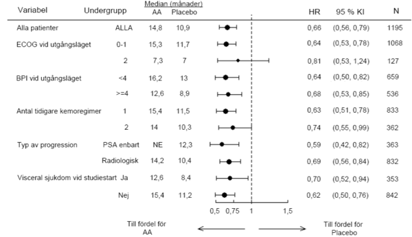 AA= abirateronacetat, BPI=Brief Pain Inventory, C.I.=konfidensintervall, ECOG=Eastern Cooperative Oncology Group Performance Score, HR=riskkvot, NE=kan ej bedömas