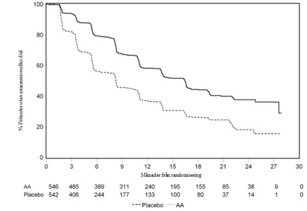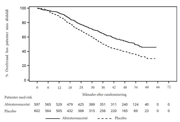 Den planerade slutliga analysen för OS utfördes efter att 741 dödsfall observerats (median uppföljningstid 49 månader). Sextiofem procent (354 av 546) av patienterna behandlade med abirateronacetat, jämfört med 71 % (387 av 542) av patienterna behandlade med placebo, hade avlidit. En statistiskt signifikant OS-fördel som talade för den abirateronacetat-behandlade gruppen påvisades med 19,4 % minskning av risken för dödsfall (riskkvot = 0,806; 95 % CI: [0,697; 0,931], p = 0,0033) och en förbättring av median OS på 4,4 månader (abirateronacetat 34,7 månader, placebo 30,3 månader) (se tabell 6 och figur 5). Den här förbättringen påvisades trots att 44 % av patienterna i placebogruppen fick abirateronacetat som efterföljande behandling.