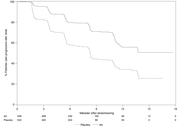 Vid den planerade rPFS analysen fanns det 401 händelser, 150 (28 %) av patienterna som behandlades med abirateronacetat och 251 (46 %) av patienterna som behandlades med placebo hade radiografiska tecken på progression eller hade avlidit. En signifikant skillnad i rPFS mellan behandlingsgrupperna observerades (se tabell 4 och figur 3).