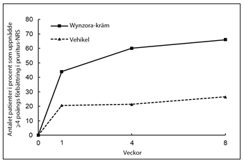 Farmakoterapeutisk grupp: Medel vid psoriasis. Övriga medel vid psoriasis för utvärtes bruk, kalcipotriol, kombinationer, ATC-kod: D05AX52VerkningsmekanismWynzora kombinerar den farmakologiska effekten av kalcipotriolhydrat som är en syntetisk vitamin D3-analog med betametasondipropionat som är en syntetisk kortikosteroid.Vid psoriasis verkar vitamin D och dess analoger främst genom att inhibera keratinocytproliferationen och inducera keratinocytdifferentieringen. Den underliggande antiproliferativa mekanismen av vitamin D i keratinocyter involverar inducering av den tillväxthämmande faktorn transforming growth factor-β och av cyklinberoende kinas-hämmare, med efterföljande tillväxtstopp i cellcykelns G1-fas plus nedreglering av de två proliferationsfaktorerna early growth response-1 och polo-like kinase-2.Vitamin D har dessutom en immunmodulerande effekt genom att undertrycka aktivering och differentiering av Th17/Th1-celler medan ett Th2/Treg-svar induceras.Vid psoriasis undertrycker kortikosteroider immunsystemet, i synnerhet proinflammatoriska cytokiner och kemokiner, och därmed hämmas T-cellsaktiveringen. På molekylär nivå verkar kortikosteroider via den intracellulära glukokortikoidreceptorn och den antiinflammatoriska funktionen beror på transrepression av proinflammatoriska transkriptionsfaktorer såsom nukleär faktor κB, aktivatorprotein-1 och interferonreglerande faktor-3.Kombinationen av kalcipotriol och betametasondipropionat främjar större antiinflammatoriska och antiproliferativa effekter än komponenterna var för sig.Farmakodynamisk effektSuppression av HPA-axeln under maximala användningsförhållanden utvärderades hos vuxna patienter (N = 27) med omfattande psoriasis där 20–30 % av kroppsytan (inklusive hårbotten) är drabbad. Behandlingen bestod av en applicering dagligen av Wynzora på kroppen och i hårbotten (75 % av patienterna hade symtom i hårbotten) i upp till 8 veckor. Binjurehämning sågs hos 1 av 27 patienter (3,7 %) efter 4 veckors behandling, samt hos ytterligare en patient efter 8 veckors behandling (N = 26).Det fanns inga tecken på minskade kortisolnivåer efter ACTH-stimulering med en ökande systemisk koncentration av B17P mätt som AUC0-7 eller Cmax, eller efter en ökning av den genomsnittliga mängden Wynzora som användes varje vecka.Inga patienter uppvisade tecken på förändrad kalciummetabolism i laboratorieundersökningar under behandlingen med Wynzora.Klinisk effekt och säkerhetEffekten av användning av Wynzora- en gång dagligen undersöktes i två randomiserade, prövarblindade, 8-veckors kliniska studier omfattande 738 patienter som behandlades med Wynzora-kräm eller motsvarande vehikel, med psoriasis på kroppen och bålen (även i hårbotten i studie 1) av mild till måttlig svårighetsgrad enligt läkarens globala bedömning av sjukdomens svårighetsgrad (Physician's Global Assessment of disease severity, PGA). Fördelningen av sjukdomens svårighetsgrad hos randomiserade patienter var likartad i de två studierna och representativ för klinisk praxis. Majoriteten av patienterna hade mild till måttlig sjukdom, 24 % hade svår sjukdom enligt den procentuella andelen kroppsyta (body surface area, BSA) påverkad (mer än 10 % av BSA påverkad) och mer än 12 % hade svår sjukdom enligt mPASI (mPASI > 12) vid baslinjen. Wynzora-kräm var effektiv vid sjukdomens samtliga svårighetsgrader. Kalcipotriol/betametasondipropionat i gelform inkluderades som aktiv komparator.Resultat från både primära och sekundära effektmått i studie 1 och studie 2 visade att Wynzora-kräm hade en överlägsen effekt jämfört med vehikel (p < 0,0001) för alla bekräftande effektmått vid behandling av psoriasis på kroppen och bålen (tabell 2). Behandlingsframgång enligt PGA definierades som ”läkt” eller ”nästan läkt” för patienter med måttlig sjukdom vid baslinjen och ”läkt” för patienter med lindrig sjukdom vid baslinjen.Tabell 2: Effekt med Wynzora i studie 1 och studie 2