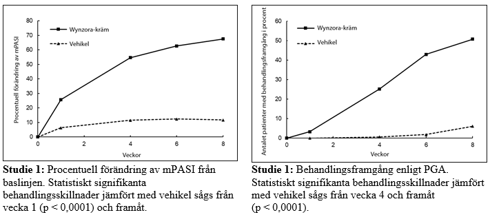 Wynzora-kräm uppvisade en statistiskt signifikant större behandlingsframgång enligt PGA vid vecka 8 jämfört med kalcipotriol/betametasondipropionat i gelform.I studie 1 undersöktes effekten av Wynzora på psoriasis i hårbotten som procentandel patienter med behandlingsframgång enligt PGA (tabell 3). Effekten av Wynzora-kräm på psoriasis i hårbotten var statistiskt signifikant större jämfört med vehikel vid vecka 4 (p = 0,0051) och vecka 8 (p = 0,0002).Tabell 3: Effekten av Wynzora på psoriasis i hårbotten i studie 1