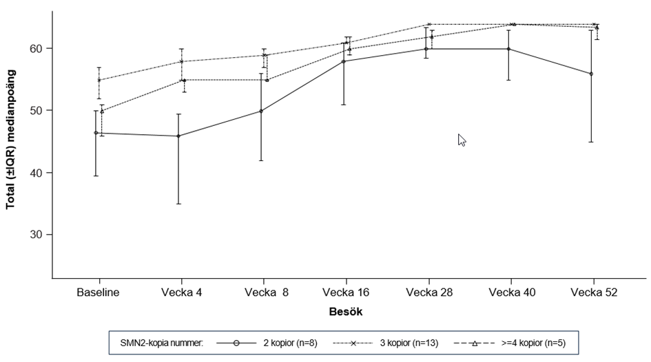 a Patienter med 2 SMN2-kopior hade en median CMAP amplitud på 2,0 (intevall 0,5 – 3,8) vid baseline.