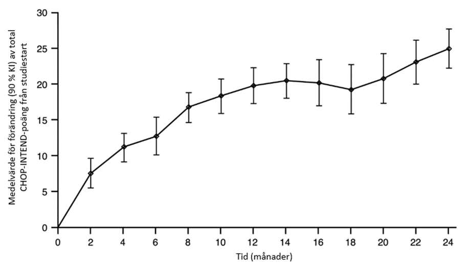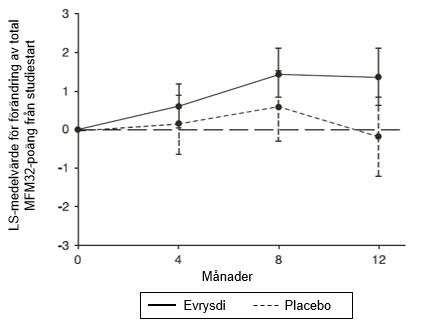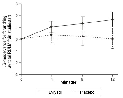 De viktigaste effektmåtten för patienter behandlade med Evrysdi visas i tabell 5 och 6 samt i figur 5.