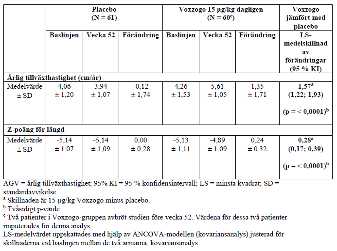 I figur 1 visas effekten av Voxzogo under tvåårsperioden för Voxzogo-behandlingsgruppen, samt effekten för placebokontrollgruppen, efter att man hade fått dagliga subkutana injektioner av Voxzogo i 52 veckor i den öppna förlängningsstudien. Förbättringar av årlig tillväxthastighet bibehölls under den fortsatta Voxzogo-behandlingen, utan evidens på takyfylaxi.