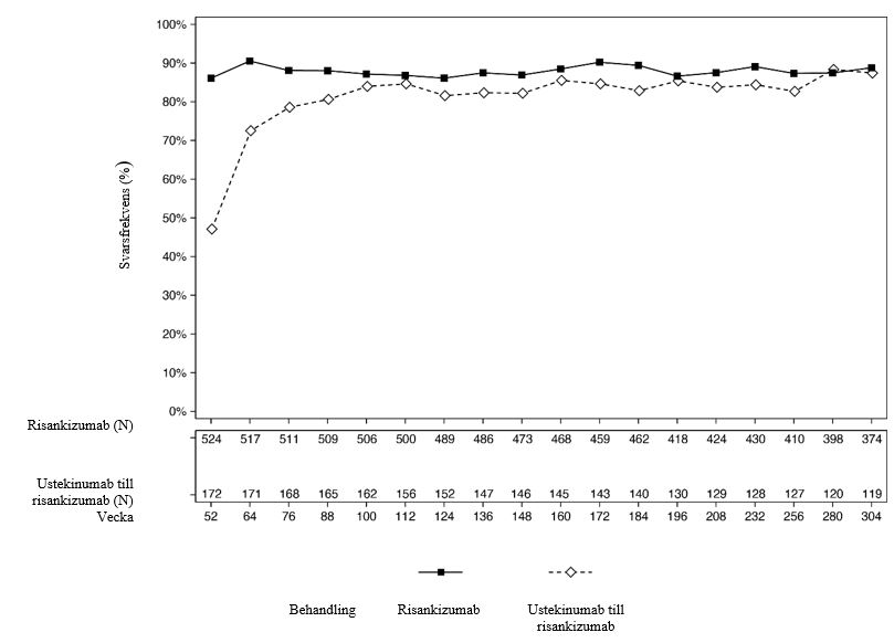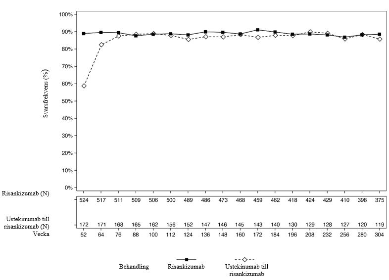 I båda studierna fick 59,6 % av patienterna samtidig behandling med metotrexat (MTX), 11,6 % fick samtidig behandling med en annan icke-biologisk DMARD och 28,9 % fick risankizumab som monoterapi.