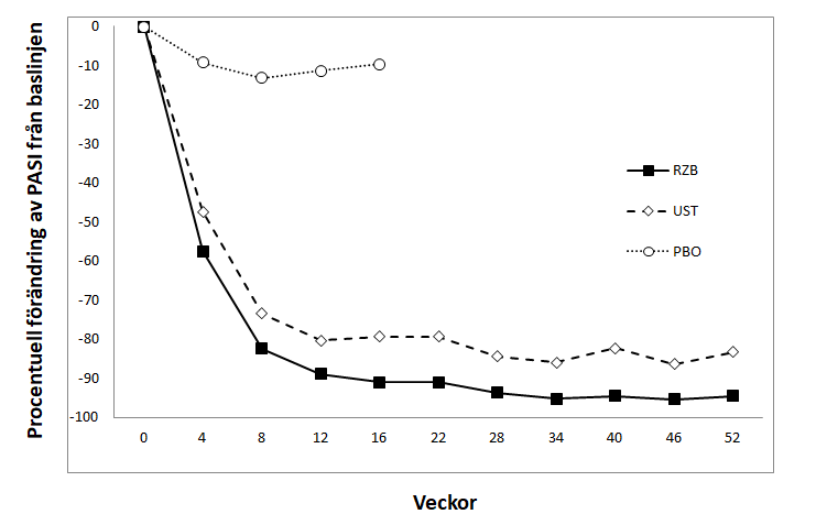 Vid baslinjen var 61,5 % av patienterna naiva för någon form av systemisk behandling (inklusive icke-biologisk och biologisk), 2,8 % hade tidigare fått ljusbehandling, 16,5 % hade tidigare fått icke-biologisk systemisk behandling och 25,7 % hade tidigare fått biologisk behandling.