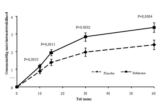 Figur 1: Genomsnittlig skillnad i smärtintensitet från baslinjen (± SE) för Submena jämfört med placebo (mätt med en 0‑10-gradig Likert-skala)
