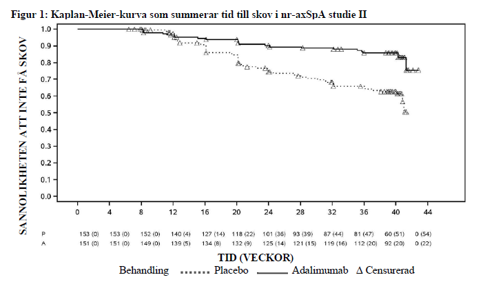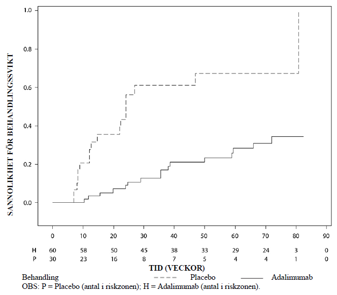 Adalimumab fördröjde signifikant tiden till behandlingssvikt i jämförelse med placebo (se figur 3, P <0,0001 från log rank test). Mediantiden till behandlingssvikt var 24,1 veckor för patienter som behandlades med placebo, medan mediantiden till behandlingssvikt för patienter som behandlades med adalimumab inte gick att fastställa eftersom mindre än hälften av dessa patienter upplevde behandlingssvikt. Adalimumab minskade signifikant risken för behandlingssvikt med 75 % jämfört med placebo, vilket framgår av hazard-kvoten (HR = 0,25 [95 % CI: 0,12; 0,49]).