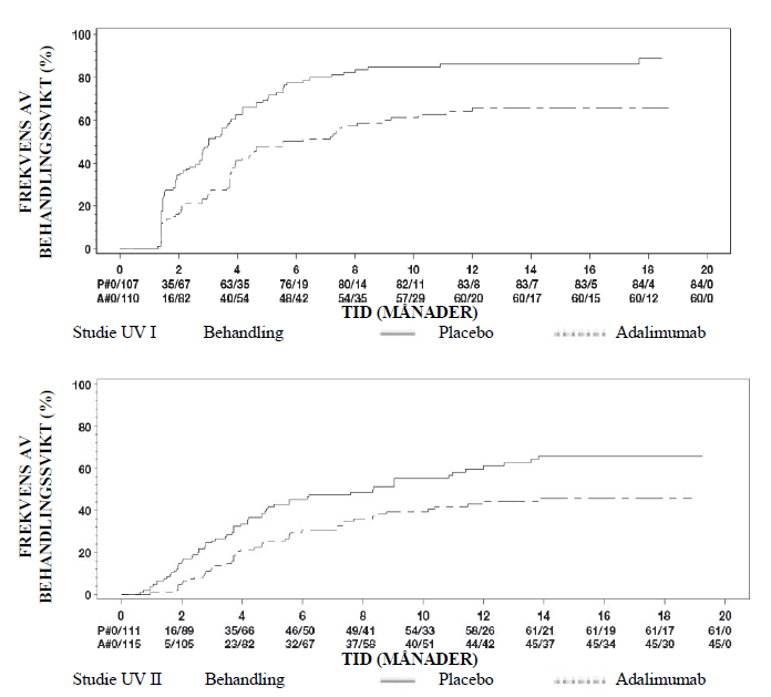 I studie UV I observerades statistisk signifikant skillnad till adalimumabs fördel jämfört med placebo för varje komponent av behandlingssvikt. I studie UV II visades statistiskt signifikanta skillnader enbart för synskärpa, men de andra komponenterna var numeriskt till fördel för adalimumab.