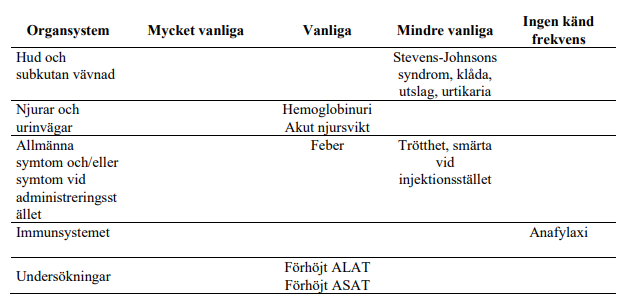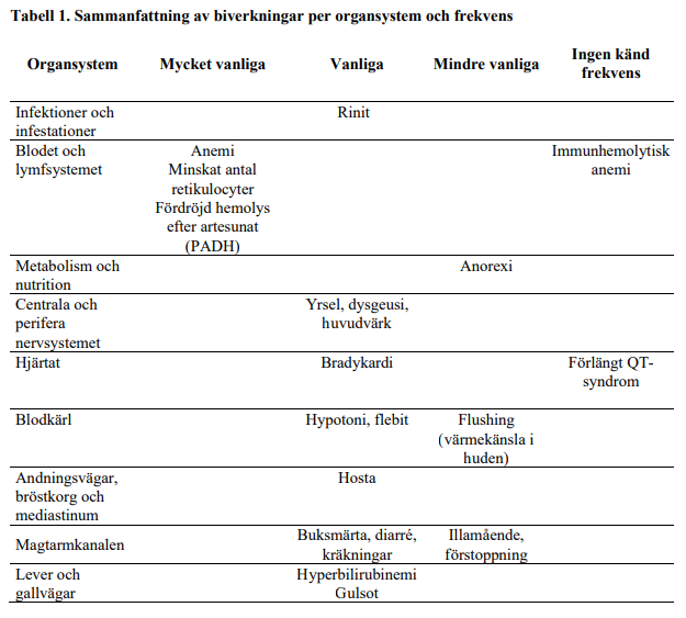 Retikulocytopeni som försvinner efter avslutad behandling med intravenöst artesunat är vanligt eller mycket vanligt förekommande (se avsnitt 4.4).