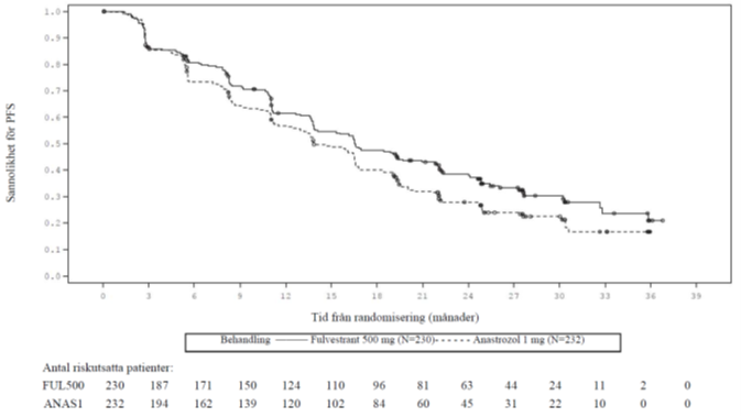 En fas 3, randomiserad, dubbelblind, dubbelplacebo, multicenterstudie av fulvestrant 500 mg jämfört med anastrozol 1 mg utfördes på postmenopausala kvinnor med ER-positiv och/eller PgR-positiv lokalt avancerad eller metastatisk bröstcancer som inte tidigare behandlats med någon hormonell behandling. Totalt randomiserades 462 patienter 1:1 i följd att få antingen fulvestrant 500 mg eller anastrozol 1 mg.