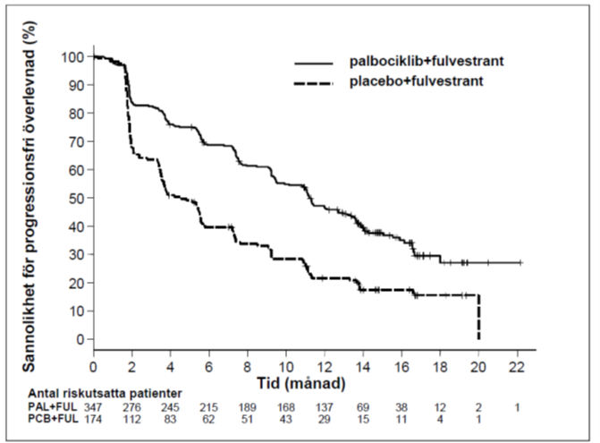 En minskad risk för sjukdomsprogression eller död i armen fulvestrant plus palbociklib observerades i alla individuella patientundergrupper definierat genom stratifieringsfaktorer och baslinjekarakteristika. Detta var tydligt hos pre/perimenopausala kvinnor (HR på 0,46 [95 % CI: 0,28, 0,75]) och postmenopausala kvinnor (HR på 0,52 [95 % CI: 0,40, 0,66]) och patienter med visceral metastatisk sjukdom (HR på 0,50 [95 % CI: 0,38, 0,65]) och icke-visceral metastatisk sjukdom (HR på 0,48 [95 % CI: 0,33, 0,71]). Nyttan kunde även observeras oberoende av tidigare behandlingslinjer i det metastatiska tillståndet, om 0 (HR på 0,59 [95 % CI: 0,37, 0,93]), 1 (HR på 0,46 [95 % CI: 0,32, 0,64]), 2 (HR på 0,48 [95 % CI: 0,30, 0,76]), eller ≥3 linjer (HR på 0,59 [95 % CI: 0,28, 1,22]).