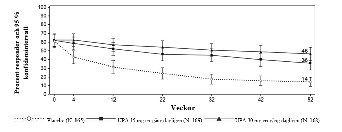 Symtomatisk remission enligt paMS, definierat som SFS ≤ 1 och RBS = 0, uppnåddes över tid till och med vecka 52 av fler patienter behandlade med upadacitinib 15 mg och 30 mg en gång dagligen jämfört med placebo (figur 2).