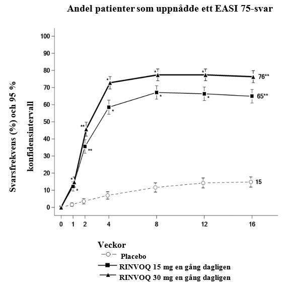 Båda studierna inkluderade en förlängd behandlingsperiod på 12 veckor med upadacitinib 30 mg en gång dagligen hos patienter som fick upadacitinib 45 mg en gång dagligen och inte uppnådde kliniskt svar enligt SF/APS (≥ 30 % minskning av daglig mycket mjuk eller flytande SF och/eller ≥ 30 % minskning av genomsnittlig daglig APS och ingen av dem större än vid baslinjen) vid vecka 12.