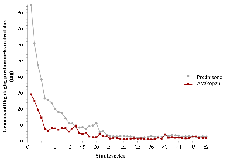 Från baslinjen till vecka 26 fick 86,1 % av patienterna som använde avakopan, glukokortikoider utom ramen för studien. I komparatorgruppen berodde största delen av glukokortikoidanvändningen på den prednisonkur som bestämdes av studieprotokollet.