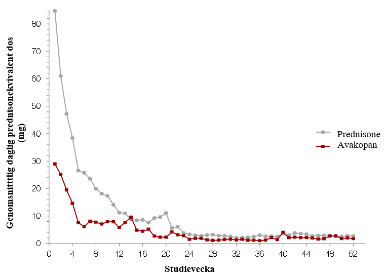 Från baslinjen till vecka 26 fick 86,1 % av patienterna som använde avakopan, glukokortikoider utom ramen för studien. I komparatorgruppen berodde största delen av glukokortikoidanvändningen på den prednisonkur som bestämdes av studieprotokollet.