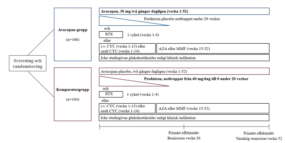 Syftet med studien var att fastställa om avakopan kan vara en effektiv behandling för patienter med ANCA‑associerad vaskulit, som samtidigt möjliggör minskad användning av glukokortikoider utan att säkerhet eller effekt försämras.