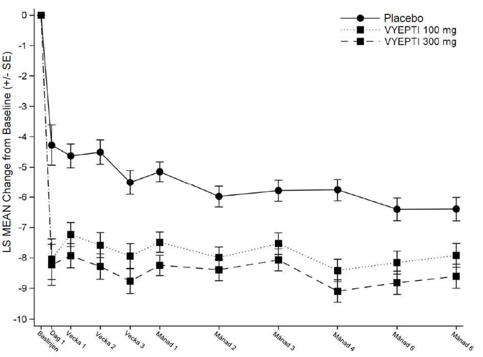 Studien visade också att en ≥ 50 % minskning av antalet MMD under vecka 1–12 uppnåddes för 42 % i VYEPTI 100 mg-gruppen och för 50 % i VYEPTI 300 mg-gruppen jämfört med 13 % i placebogruppen. Minskningen av antalet MMD på ≥ 75 % under vecka 1–12 uppnåddes hos 16 % i VYEPTI 100 mg-gruppen och 19 % i VYEPTI 300 mg-gruppen jämfört med 2 % av patienterna i placebogruppen.