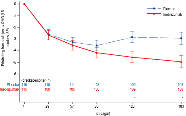 Det viktiga sekundära effektmåttet var förändringen från baslinjen av QMG‑poängen vecka 26 i den totala populationen. QMG‑poängen är ett kategoriskt graderingssystem med 13 frågor som kvantitativt mäter sjukdomsnedsättningen genom att huvudsakligen bedöma muskelsvaghet. Varje fråga bedöms på en 4‑poängsskala där 0 representerar ingen nedsättning och en poäng på 3 representerar allvarlig nedsättning. En total möjlig poäng varierar från 0 till 39, där högre poäng indikerar allvarligare nedsättning. En statistiskt signifikant skillnad till förmån för inebilizumab observerades i medelförändringen från baslinjen av QMG‑totalpoängen (‑4,9 för inebilizumab kontra ‑2,9 för placebo, en skillnad på ‑2,0; 95 % KI: ‑3,3; ‑0,7).