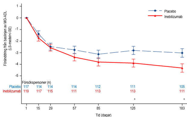 Effekten av inebilizumab mättes med hjälp av MG‑ADL‑skalan, som bedömer effekten av gMG på ett frågeformulär med 8 frågor som fokuserar på MG‑patientens relevanta symtom och funktionella förmåga vid dagliga aktiviteter. Varje fråga bedöms på en 4‑poängsskala där en poäng på 0 representerar normal funktion och en poäng på 3 representerar den allvarligaste påverkan av sjukdomen. Den totala MG‑ADL‑poängen varierar från 0 till 24, där högre poäng indikerar större nedsättning.