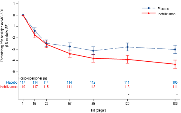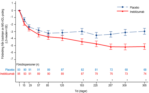 Effekten av inebilizumab mättes med hjälp av MG‑ADL‑skalan, som bedömer effekten av gMG på ett frågeformulär med 8 frågor som fokuserar på MG‑patientens relevanta symtom och funktionella förmåga vid dagliga aktiviteter. Varje fråga bedöms på en 4‑poängsskala där en poäng på 0 representerar normal funktion och en poäng på 3 representerar den allvarligaste påverkan av sjukdomen. Den totala MG‑ADL‑poängen varierar från 0 till 24, där högre poäng indikerar större nedsättning.