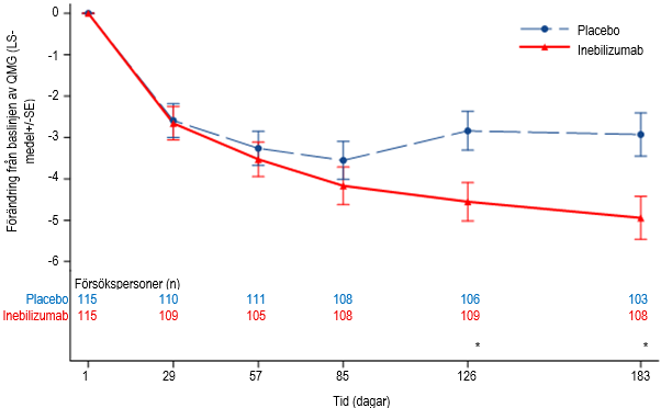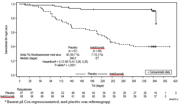 I studien uppnåddes det primära effektmåttet, tid till det första behandlade och av IgG4‑RD‑skov fastställd av bedömningskommitté, vilket var längre i inebilizumabgruppen jämfört med i placebogruppen (hasardkvot: 0,13; p < 0,0001; se figur 2). De viktiga sekundära effektmåtten uppnåddes också med statistisk signifikans (se tabell 7).