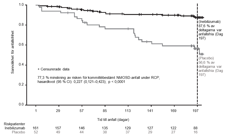 Resultat för AQP4-IgG-seropositiva patienter anges i Tabell 5 och Figur 1. I denna studie minskade behandling med inebilizumab statistiskt signifikant risken för ett kommittébedömt NMOSD-anfall, jämfört med behandling med placebo (hasardkvot: 0,227, p < 0,0001; 77,3 % minskning av risken för kommittébedömt NMOSD-anfall) hos AQP4-IgG-seropositiva patienter. Ingen behandlingsfördel observerades hos AQP4-IgG-seronegativa patienter.