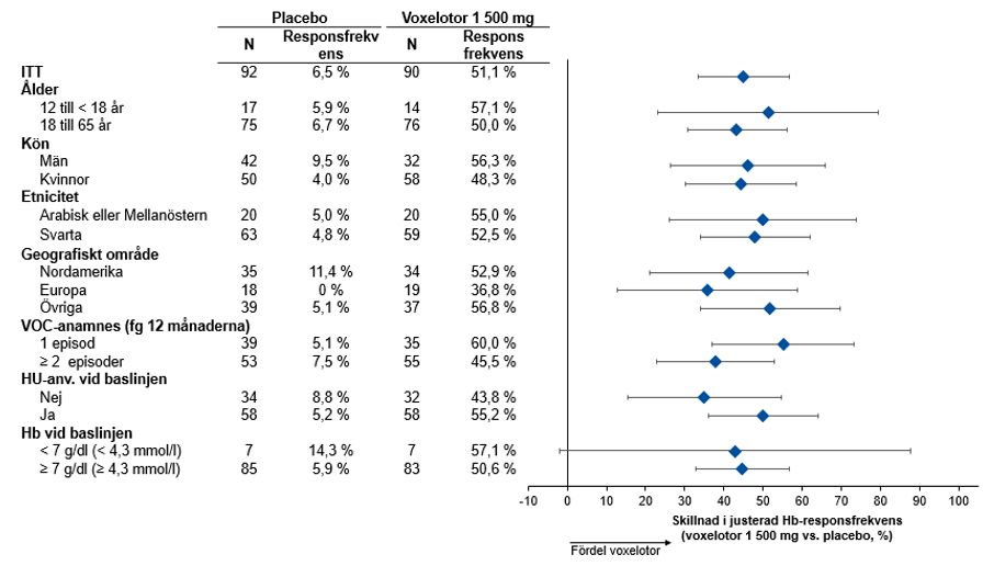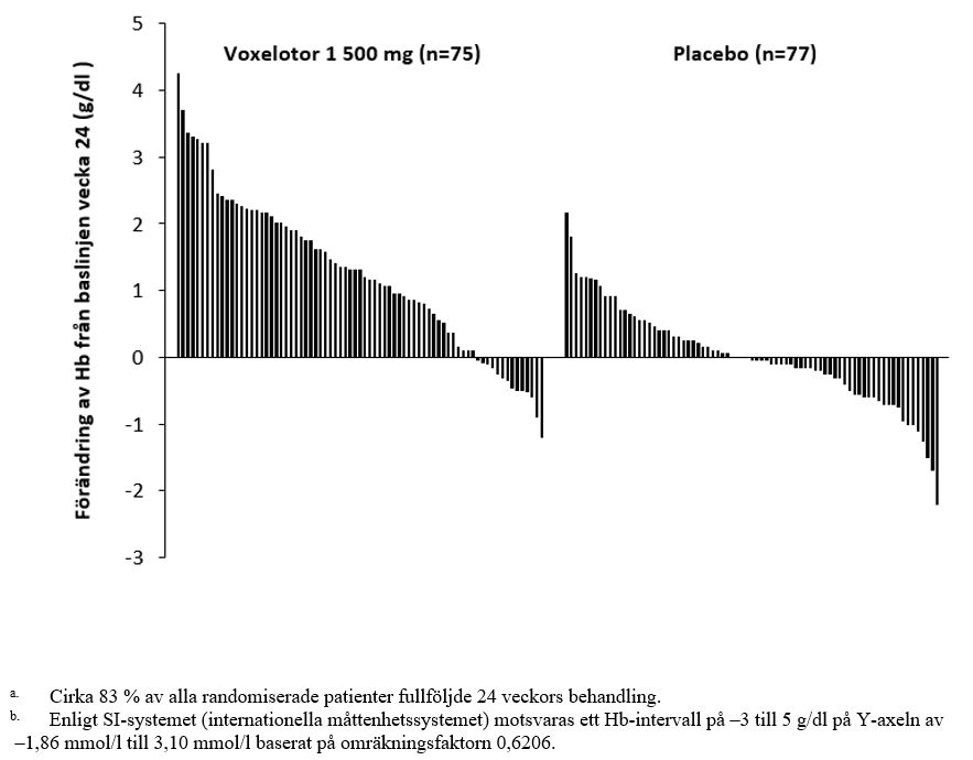 Effekt baserades på följande primära effektmått: HB-responsfrekvens definierat som en Hb-ökning på > 1 g/dl (0,62 mmol/l) från baslinjen till vecka 24 hos patienter som behandlades med voxelotor 1 500 mg jämfört med placebo. Responsfrekvensen för voxelotor 1 500 mg var 51,1 % (46/90) jämfört med 6,5 % (6/92) i placebogruppen (p < 0,001). Inga avvikande undergrupper observerades (figur 1). Ökningen av Hb-värdet kunde ses vecka 2 och kvarstod t.o.m. vecka 72. Distributionen av Hb-förändringen från baslinjen för enskilda patienter som genomgick 24 veckors behandling med voxelotor 1 500 mg eller placebo visas i figur 2.