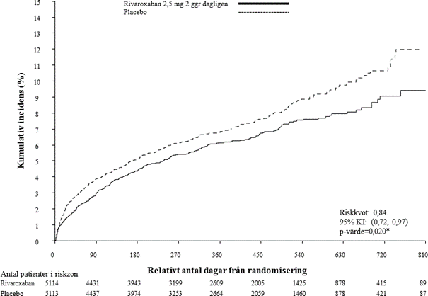 Den primära effektanalysen (d.v.s. dödsorsak oavsett orsak, hjärtinfarkt, eller stroke) visade ingen signifikant statistisk skillnad mellan gruppen som fick rivaroxaban 2,5 mg två gånger dagligen och placebo med riskkvot=0,94 (95 % KI 0,84‑1,05), p=0,270. För dödsorsakoavsett orsak var det ingen skillnad mellan rivaroxaban och placebo i antal händelser (frekvensen av händelser per 100 patientår; 11,41 jämfört med 11,63, riskkvot: 0,98; 95 % KI: 0,87 till 1,10; p=0,743). Frekvensen av händelser av hjärtinfarkter per 100 patient-år (rivaroxaban jämfört med placebo) var 2,08 jämfört med 2,52 (riskkvot 0,83; 95 % KI: 0,63 till 1,08; p=0,165) och för stroke var frekvensen av händelser per 100 patient-år 1,08 jämfört med 1,62 (riskkvot: 0,66; 95 % KI: 0,47 till 0,95; p=0,023). Det primära säkerhetsmåttet (d.v.s. blödning med dödlig utgång eller blödning i ett kritiskt organ med risk för permanent funktionsnedsättning), inträffade hos 18 (0,7 %) patienter i gruppen med rivaroxaban 2,5 mg två gånger daglien respektive 23 (0,9 %) av patienterna i placebogruppen (riskkvot=0,80; 95 % KI 0,43‑1,49; p=0,484). Det var en statistisk signifikant ökning av allvarliga blödningar enligt ISTH-kriterier i rivaroxabangruppen jämfört med placebo (frekvensen av händelser per 100 patientår: 2,04 jämfört med 1,21, riskkvot 1,68; 95 % KI: 1,18 till 2,39; p=0,003).